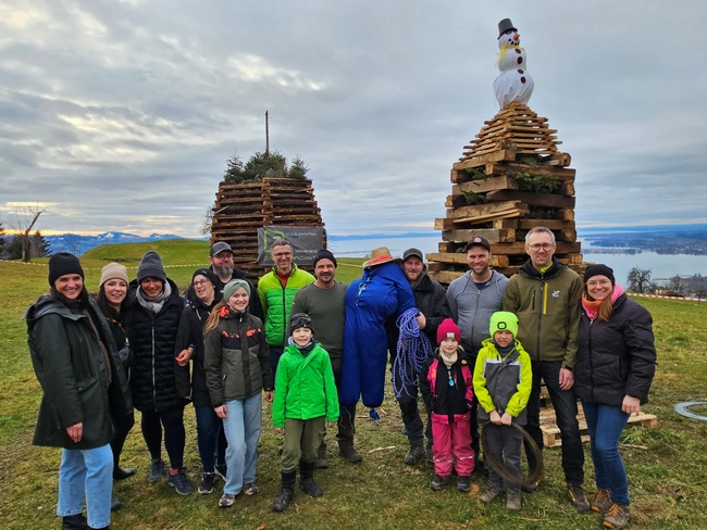 Auch am Buchenberg forderte der Aufbau des Funkens am Samstag bei Regen und aufgeweichtem Boden den vollen Einsatz vom bewährten Team um Funkenmeister Josef Pregl. Wenn nicht ganz so hoch wie in den Vorjahren, hat sich der Aufwand doch gelohnt.