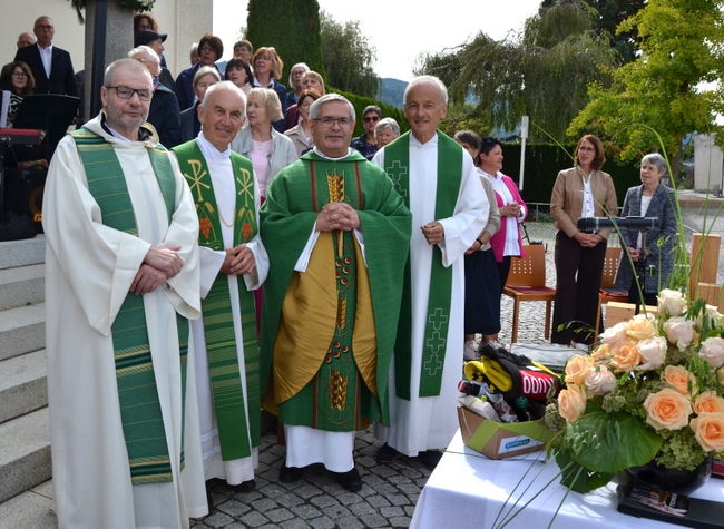 Zelebriert wurde die festliche Eucharistiefeier vom neuen Pfarrmoderator Romeo Pal, zusammen mit Vikar Peter Loretz, Pater Dominikus Matt und Dekan Paul Burtscher. Für die musikalische Umrahmung sorgte ein eigens hiefür zusammengestellter Projektchor mit Sängerinnen und Sängern aus allen Pfarren unter der bewährten Leitung von Brigitte und Alfred Dünser.